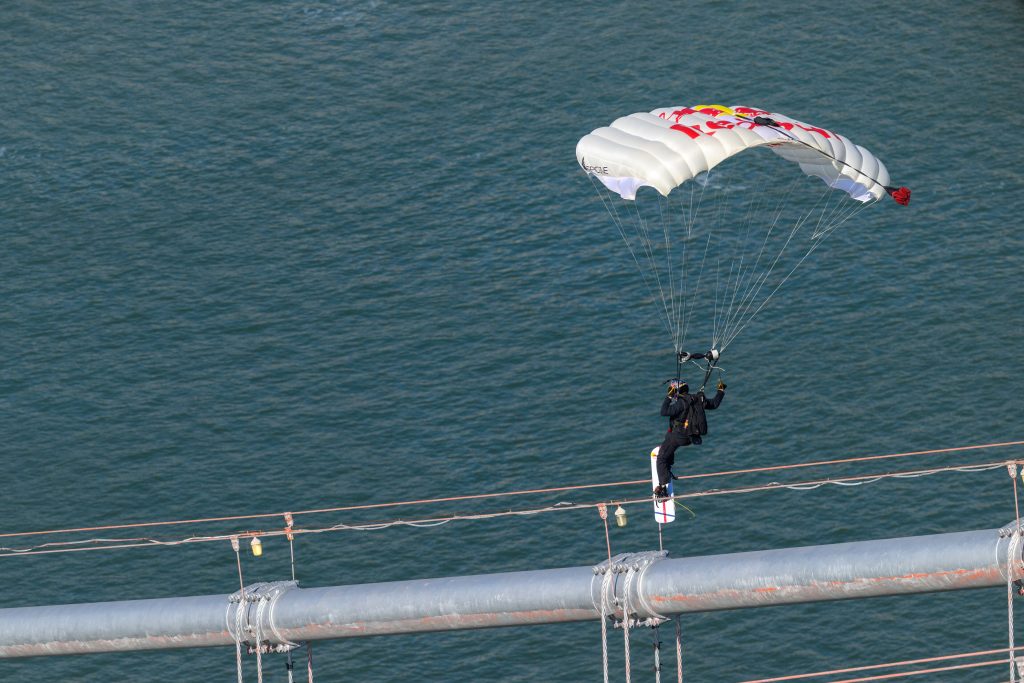 The Red Bull Air Force athlete – who has completed more than 22,000 skydives and is regarded as one of the sport’s leading figures – jumped from a helicopter 5,500 feet above the Bay, strapped to a specialised custom board. He deployed his parachute shortly after exiting the aircraft and began his three-minute flight path toward the bridge cables, carefully adjusting for wind currents to maintain precision. As his board aligned with the cables, he rode along them, then executed a sharp right turn. MacCormac then descended the remaining 60 metres to the floating barge below.
